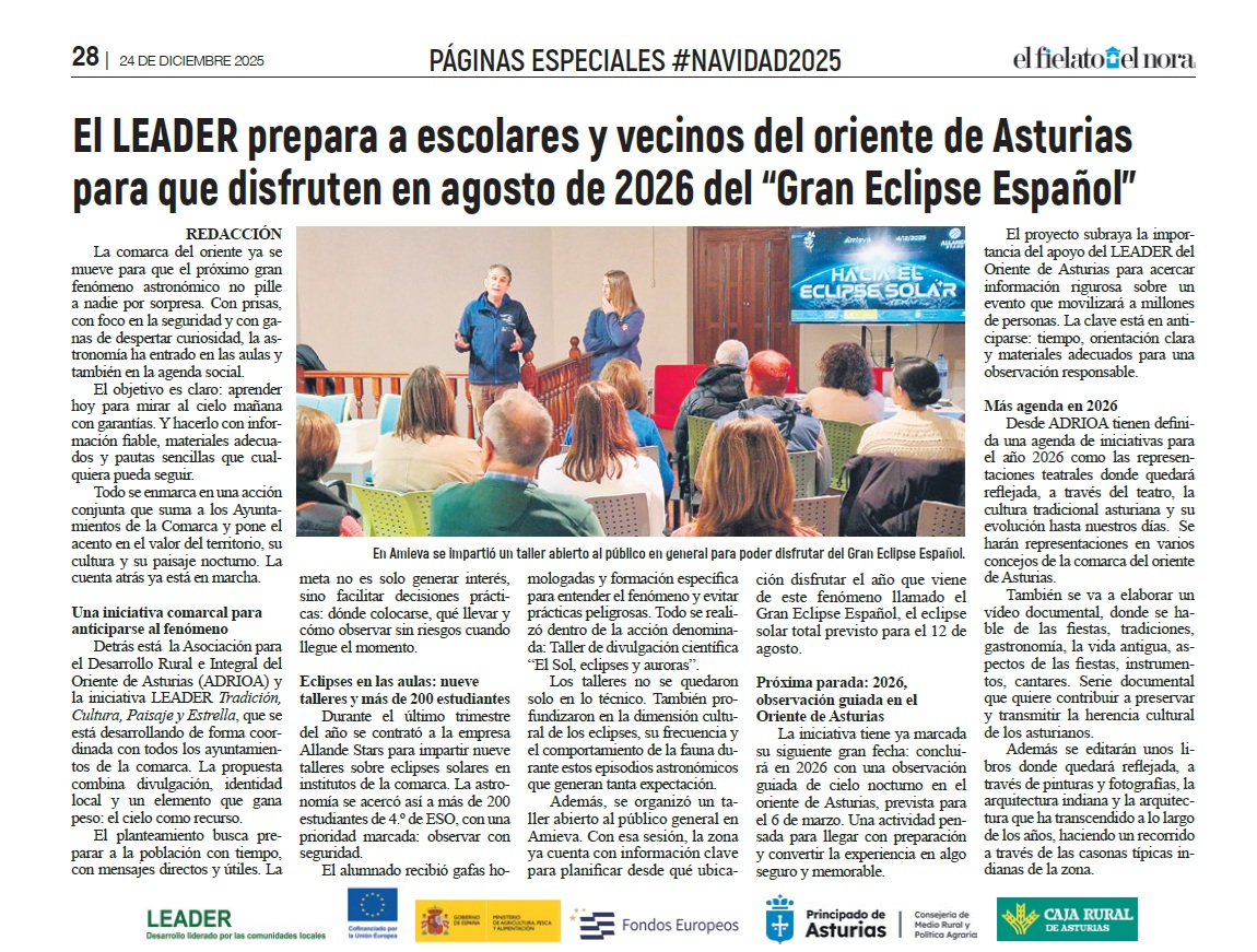 Dentro del área de trabajo de este proyecto y dado nuestro espectacular paisaje y cielo limpio en zonas de nuestra comarca, se realizarán Talleres de divulgación científica, para los alumnos/as de último curso de ESO y de Bachillerato, donde se verá el sol, eclipses y auroras, todo ello con la finalidad de llevar a cabo la preparación para el eclipse solar total del doce de agosto del año 2026, que será un gran acontecimiento astronómico para Asturias.